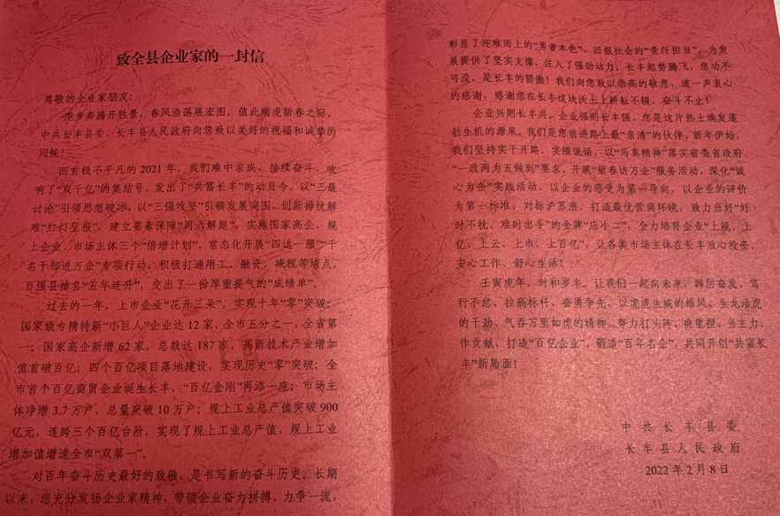 县政协副主席张守芳带来了长丰县委及县政府致全县企业家的一封信,为公司送来美好的祝福和诚挚的问候!